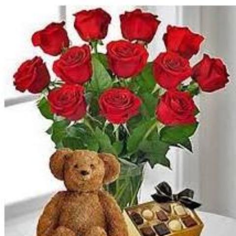 Previous Product Next ProductLuminous with classic beauty, this lovely Vase of twelve red world's best Ecuador roses with chocolate and bear will truly express all you have to say. A most wonderful and unexpected Birthday and Anniversary surprise!