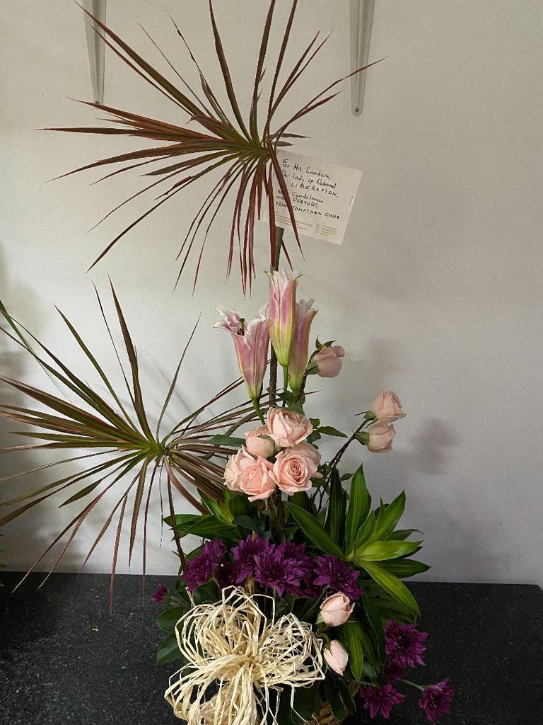 Baby pink roses with stargazer in a basket*