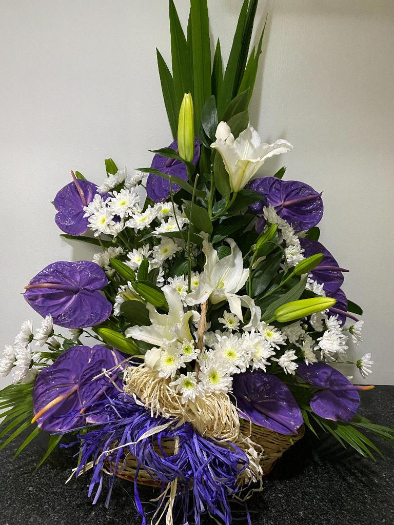 PURPLE ANTHURIUM WITH WHITE CASA BLANCA IN A BASKET